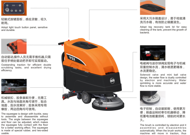 -刷盤:電子控制,自動裝卸刷,使用更方便;刷盤運轉時牽引機器移動,降低蓄電池能量損耗,續(xù)航時間更長久。